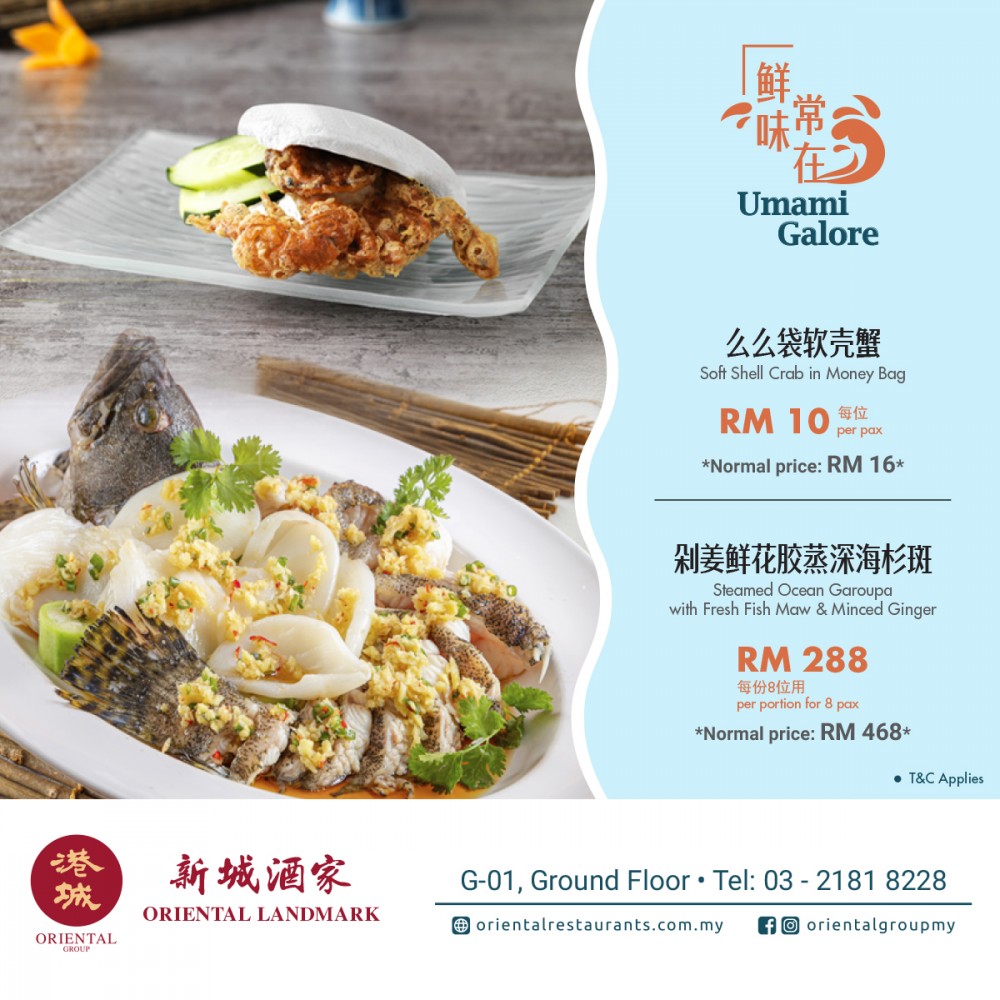 Introducing Oriental Landmark's signature dishes - popular Steamed Ocean Garoupa with Fresh Fish Maw & Minced Ginger and Soft Shell Crab in Money Bag.